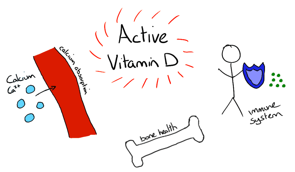 Active vitamin D can travel to the intestine where your body is breaking down and absorbing food. It signals the body to take in more calcium into your blood stream.