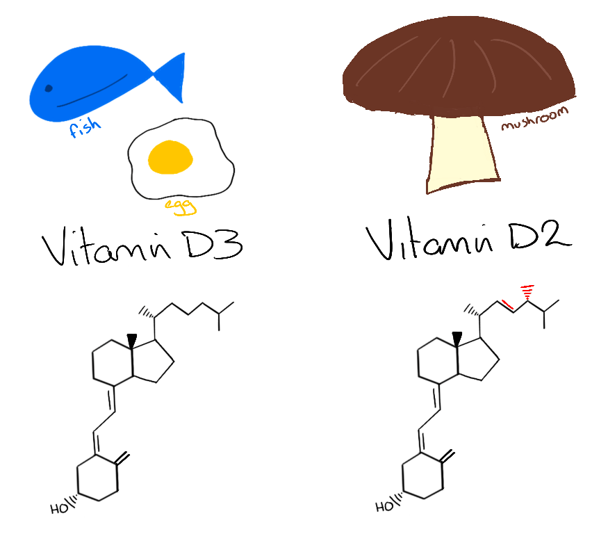 Vitamin D can also be found in some of the food that we eat. Vitamin D from animal sources like oily fish and eggs is the D3 variant, the same that we make in our skin. If we get vitamin D from plants, like mushrooms, it is has a slightly different structure and is called vitamin D2. They look very similar with only a few small changes. They can both be used by the body to produce the active vitamin D.